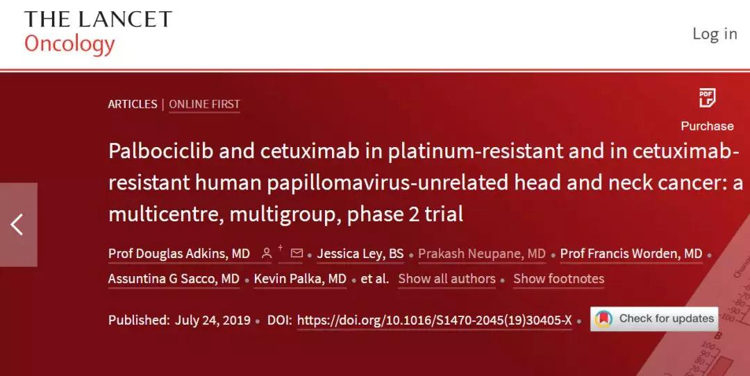 研究方法:入组患者为可测量的疾病(RECIST 1.1评估)、ECOG评分0-2、≥18岁;铂治疗进展但未接受西妥昔单抗治疗(第1组),或西妥昔单抗治疗进展(第2组)。所有患者在28天周期内口服哌柏西利(125 mg/天,第1-21天)和静脉注射西妥昔单抗(400 mg/m2,第1周期,第1天,然后每周250 mg/m2)。主要终点为客观反应率。(研究正在进行中,编号为NCT02101034)