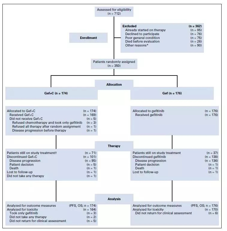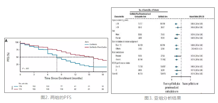 这是一项开放标签的随机III期临床研究,携带EGFR敏感突变(包括非经典突变)的初治患者入组研究。患者PS评分要求在0-2分之间。符合入组标准的患者按照PS评分(0,1 vs 2)及突变类型(19 vs 18或21)进行分层后,按1:1的比例接受吉非替尼单药(单药组, 250 mg, 口服, 每日一次)或联合培美曲塞(联合组, 500 mg/m2)及卡铂(AUC=5)治疗。化疗每21天为一个治疗周期,4周期化疗后允许进行培美曲塞的维持治疗,疗效评估每2月进行一次。研究的主要终点为研究者评估的PFS,次要研究终点为OS、安全性、客观反应及生活质量。