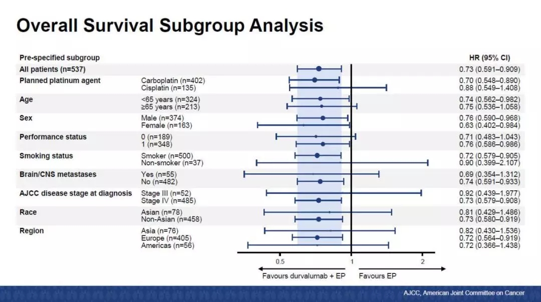 CASPIAN研究中,durvalumab联合组和单纯化疗组分别入组了268例和269例患者,与单用化疗相比,durvalumab联合4周期的标准化疗可显著改善OS,具有统计学意义和临床意义。durvalumab联合化疗组的中位OS为13.0个月,单纯化疗组的中位OS是10.3个月,联合组死亡风险降低了27%(HR=0.73,p=0.0047),在所有亚组人群中均有获益。durvalumab联合化疗组的12个月和18个月OS率分别为53.7%和33.9%,而单纯化疗组分别为39.8%和24.7%,联合组提高了13.9%的12个月OS率和9.2%的18个月OS率。