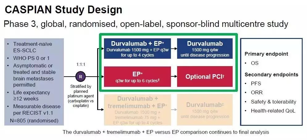 本次WCLC大会中,公布了PD-L1单抗Durvalumab在广泛期SCLC一线治疗的CASPIAN研究结果,研究分为三组:PD-L1(Durvalumab)+化疗(依托泊苷/铂类);化疗(依托泊苷/铂类);四药联合,即PD-L1(Durvalumab)+化疗(依托泊苷/铂类)+ CTLA4抑制剂(tremelimumab)