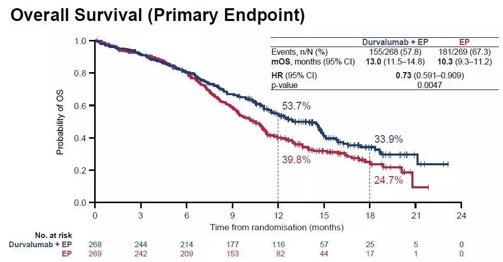 中位OS:研究主要终点是OS,四药联合组的数据还未完成,化疗+免疫组和标准化疗组的OS分别为13.0个月 vs.10.3个月,1年OS率为53.7% vs.39.8%,18个月OS率为33.9% vs.24.7%。
