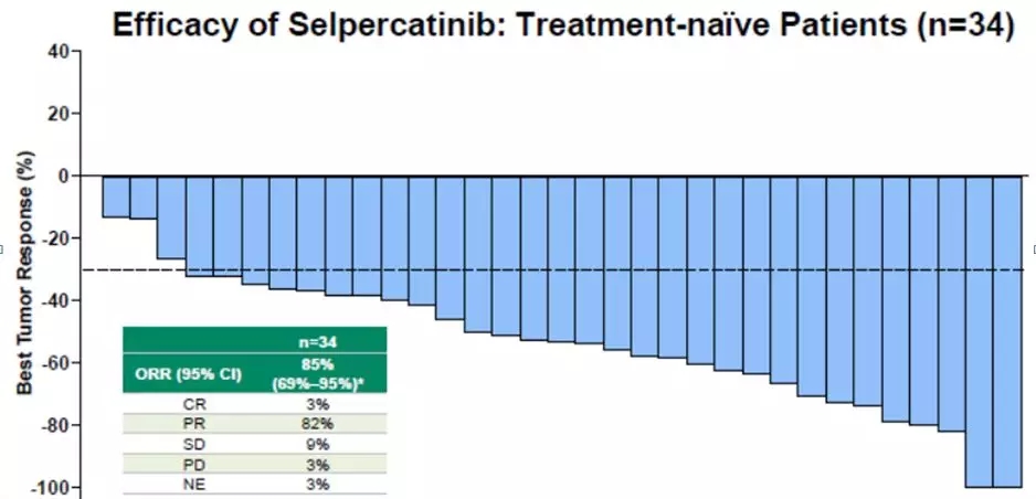 144例患者中,KIF5B是最常见的融合伴侣,占59%,其次是CCDC6,占22%。在初治的34例患者中,评估为CR、PR或SD的患者分别占3%、82%和9%,仅有3%的患者疗效评估为PD,ORR达到85%(图2),目前,中位PFS和OS尚未成熟。