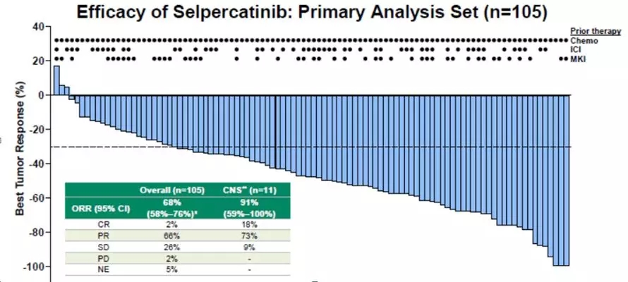 而对于既往接受过至少1种治疗方案的患者而言,Loxo-292的治疗效果同样惊艳。这一队列共纳入105例患者,所有患者既往至少接受含铂双药化疗,43.8%的患者既往接受过多靶点药物治疗,22.8%为重度治疗患者(指接受至少3种不同治疗)。这105例患者中,分别有2%、66%和26%的患者评估为CR、PR或SD,评估为PD的患者仅为2%,ORR达到68%。11例患者存在CNS转移,分别有18%、73%和9%的患者评估为CR、PR和SD,没有患者评估为PD,ORR和DCR达到了91%和100%,进一步分析发现,既往治疗线数不会显著影响ORR(图3)。