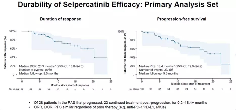 LIBRETTO-001研究是一项I/II期多队列临床试验(纳入携带RET融合的NSCLC和甲状腺癌患者及RET突变的甲状腺癌患者),研究分为I期剂量爬坡(20 mg 每日一次至240 mg,每日两次)和II期剂量扩展两个阶段,II期推荐治疗剂量设定为160 mg,口服,每日两次。其中肺癌队列入组253例患者,105例经治患者组成首要分析集(PAS集),另有34例为初治患者。研究的主要终点为ORR,次要终点包括反应持续时间、PFS及安全性(图1)。
