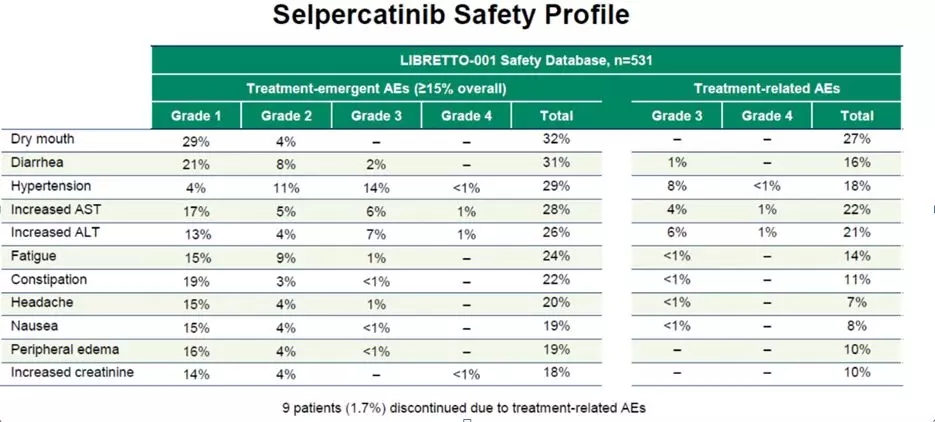 安全性方面,Loxo-292治疗相关的3度及以上不良反应发生率为26%,最常见严重不良反应为转氨酶升高和高血压,仅有1.7%的患者因治疗相关的不良反应导致停药(图5)。