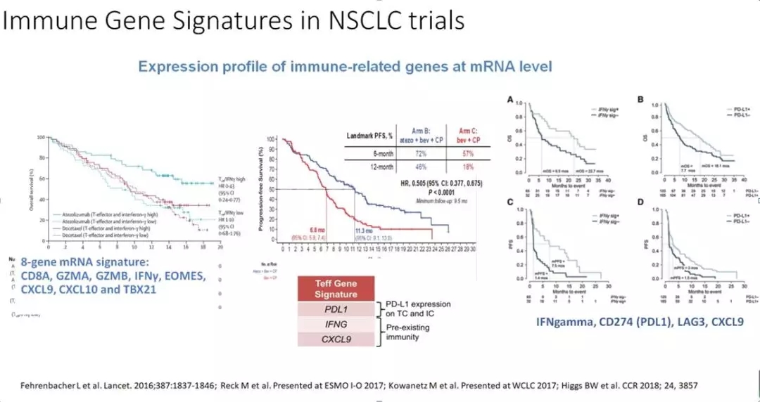 2017年,一项对OAK进行回顾性分析的III期的临床研究旨在探讨肿瘤微环境与ICI疗效的关系。在肺癌中,肿瘤微环境的评估主要是利用新鲜或冰冻肿瘤组织检测免疫相关基因的mRNA水平。该研究发现Teff signature高表达(cut-off 50%)与OS的延长相关。自此,immune gene signature走进了人们的视线。2018年,CheckMate275研究发现在尿路上皮癌中,微环境中的高水平的髓源性抑制细胞(MDSC)与较短的总生存有关。这提示我们肿瘤微环境中仍有许多值得我们探索的biomarker。