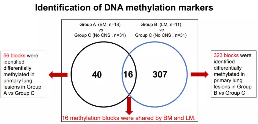 研究发现, A组(脑转移组)及B组(脑膜转移组)的原发灶与转移灶样本在驱动基因及TP53的检出上具有高度的一致性。脑转移病灶中发现了更多新的拷贝数变异(CNV)。同时,对三组人群肺原发灶样本的基因变异状态进行比较,结果发现,除了KEAP1基因变异在脑转移组富集之外,其他基因变异在三组人群检出率相当。由此推断,基于基因变异的检测可能无法预测中枢神经系统转移的发生。而甲基化状态在三组之间存在明显的差异。A组与C组(无中枢神经系统转移组)相比,共发现56个位点DNA甲基化水平存在差异;而B组与C组相比,323个位点存在DNA甲基化水平差异,将两个比较结果取交集,最终获得了16个甲基化异常位点。其中15个甲基化异常的位点在脑转移及脑膜转移组变化趋势一致。