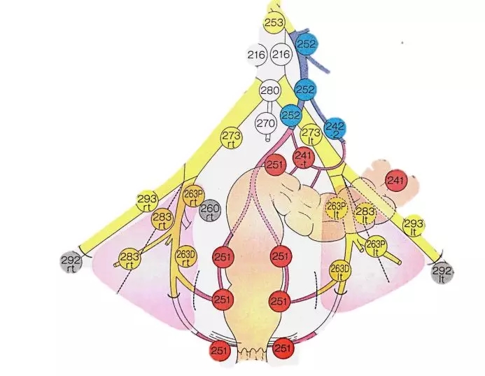 在侧方淋巴结清扫过程中,在保证治疗根治性的同时最大程度的保障其功能性颇为重要。基于日本《大肠癌诊疗规约(第8版)》,直肠癌的侧方淋巴结转移主要在髂内淋巴结(263D、263P)和闭孔淋巴结(283),是侧方淋巴结清扫的主要区域;相比之下,髂外和髂总区域的转移相当罕见,结肠淋巴结分布见图1。清扫术中,应注意保留的结构:①输尿管;②盆神经丛,排尿及性功能障碍密切相关;③闭孔神经,支配大腿的收肌,对髋关节的活动及大腿内侧的感觉。