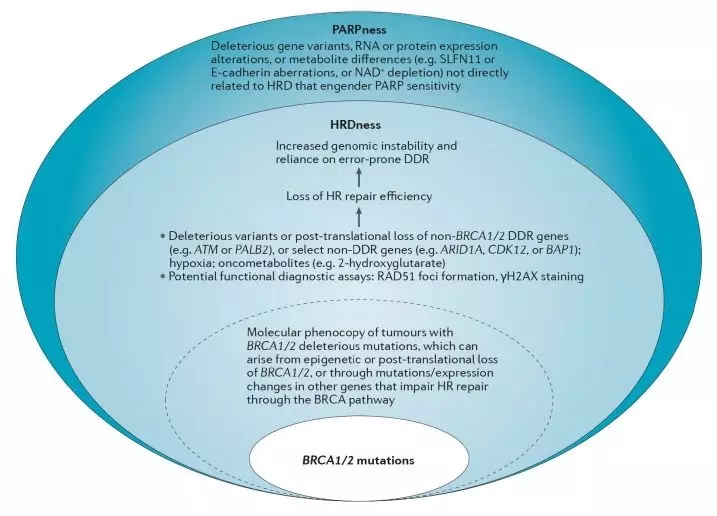 关于PARPi从应用于BRCA1/2突变扩大至体系BRCA突变乃至HRD,目前在卵巢癌研究的更深入,目前卵巢癌已经从复发的BRCA突变人群到铂敏感复发人群,今年ESMO报道的PAOLA-1研究已经从BRCA人群扩展至HRD乃至整体一线人群;对于乳腺癌2019年ASCO报道的GeparOLA研究对携带t/pBRCA突变或HRD高评分乳腺癌患者奥拉帕利联合化疗在新辅助治疗的探索,初步的结果已经显示了在HRD人群的获益,未来PARPi的研究方向会集中在从BRCA突变至PARPness的探索(图4)