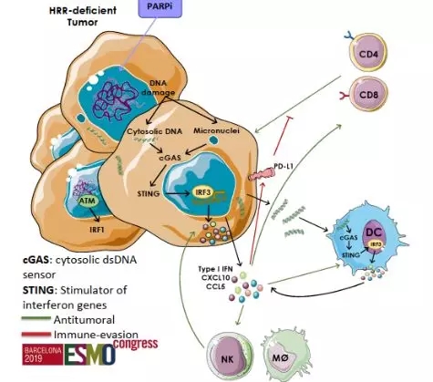 从临床前到临床研究发现存在HRD的肿瘤对PARP抑制剂(PARPi)敏感,并表现出胞质DNA增高,进而导致STING通路的激活和PD-L1的上调(图2)。来自意大利和西班牙的临床前研究分析PARPi是否会诱导PD-L1的上调并限制PARPi的疗效,以及是否可通过PARPi联合抗PD-L1治疗增强PARPi的疗效。
