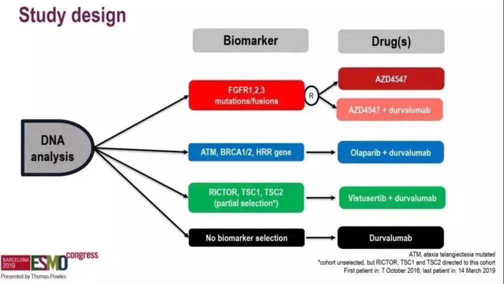 方法:根据二代测序基因突变和改变情况,晚期铂类化疗失败且未接受过免疫治疗的尿路上皮癌患者被分入以下队列。队列A将FGFR突变或融合的患者随机分入FGFR抑制剂(AZD4547)单药治疗组和度伐单抗(MEDI4736)联合FGFR抑制剂(AZD4547)治组;队列B将ATM、BRCA1/2、HRR基因改变患者使用PARP抑制剂奥拉帕尼联合度伐单抗治疗;队列E——为mTOR抑制剂维斯图替尼(vistusertib)联合度伐单抗治疗组,本组患者生物标志物不作选择,但具有RICTOR扩增或TSC1 / 2突变也将被纳入;对于无相关基因改变的患者,将纳入队列D(度伐单抗单药治疗)和队列F(度伐单抗联合STAT3的反义寡核苷酸治疗药物AZD9150)。主要研究终点包括靶向治疗的安全性和耐受性。主要的次要研究终点包括ORR和OS。根据PD-L1表达情况和肿瘤突变负荷(TMB)进行疗效分析。