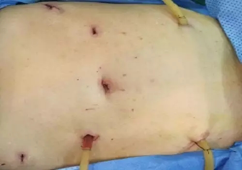 图2. 术后患者腹壁仅有七个微小的戳卡孔,没有切口