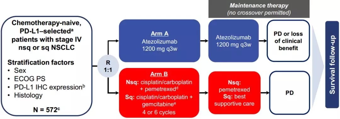 IMpower 110是一项III期、开放性、随机对照、全球多中心临床试验,对比了阿特珠单抗和标准化疗一线治疗经PD-L1筛选的572例IV期NSCLC患者。主要研究终点为总生存期(OS),次要终点为研究者评估的无进展生存期(PFS)、客观缓解率(ORR)以及缓解持续时间(DoR)。