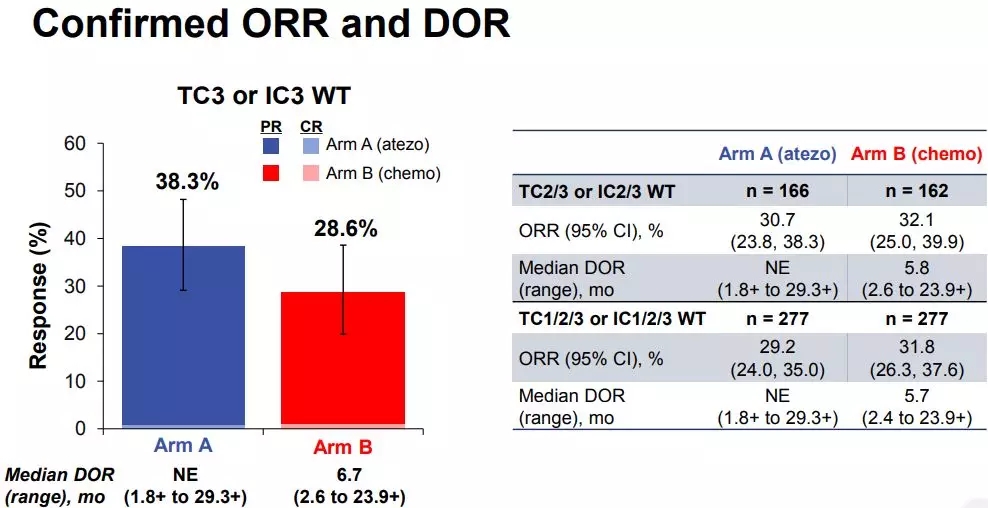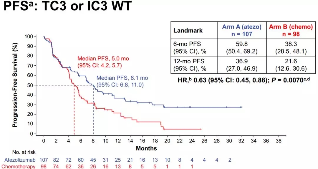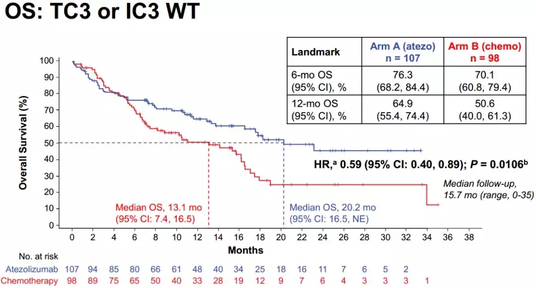 中位随访时间15.7个月,阿特珠单抗和化疗使PD-L1高表达(TC3/IC3-WT)组患者的中位OS达到20.2月 vs. 13.1月(HR=0.59, 95% CI: 0.40~0.89; P=0.0106);12个月OS率为64.9%vs. 50.6%;PD-L1高表达组的中位PFS分别为8.1月vs. 5.0月;12个月PFS率为36.9%vs. 21.6%。两组的ORR分别为38.3% vs. 28.6%,DoR分别为NE (1.8+~29.3+) vs. 6.7个月(2.6~23.9+)。