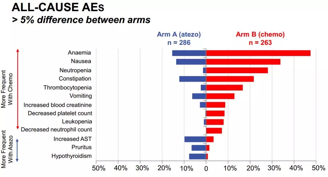 阿特珠单抗的安全性与其既往研究中的数据一致,没有出现新的不良信号。阿特珠单抗和化疗组的所有原因不良事件(AE)的发生率分别为90.2%和94.7%;3~4度不良反应分别为31.8%和53.6%。免疫组和化疗组的治疗相关不良事件(TRAE)分别为60.5%和85.2%,3~4级TRAE 为12.9% 和44.1%,显示出免疫疗法有更好的安全性。