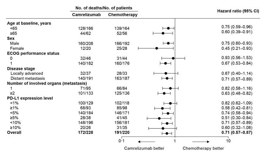在疗效方面,研究结果显示:①在晚期/转移性食管鳞癌二线治疗中,Camrelizumab较之于化疗可显著延长患者的生存,化疗组OS为6.2个月,Camrelizumab组OS则为8.3个月,HR=0.71(95%CI:0.57~0.87,P=0.001)(图1)。 ②从亚组分析结果来看,各亚组均能从Camrelizumab治疗中获益(图2)。在客观缓解率(ORR)方面,化疗组患者的ORR为6.4%,这与KEYNOTE-181研究的结果类似,而该研究中Camrelizumab组的ORR可达20.2%,可见Camrelizumab单药的有效率要明显优于化疗。 ③此外,疾病控制率(DCR)也要优于化疗组,尤其是缓解持续时间(DOR)上,Camrelizumab组的中位缓解时间可达7.4个月,而化疗组仅为3.4个月,可见Camrelizumab的疗效更持久。