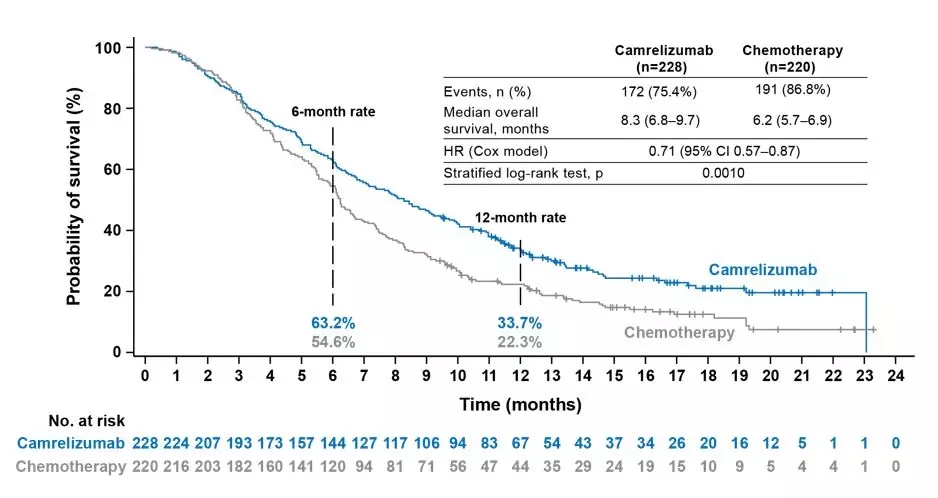 该研究是首项针对中国人群、在食管鳞癌二线治疗中比较PD-1抑制剂和化疗的临床试验,以总体生存(OS)为主要终点,可见Camrelizumab组对比化疗显著延长OS,死亡率降低近30%,并且Camrelizumab的耐受性良好、安全性可控。这将为晚期/转移性食管鳞癌的二线治疗带来新的选择。