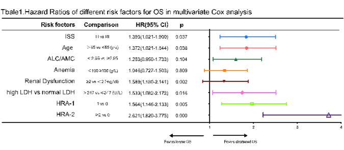 该研究总结了MM中多个公认的以及近年来被报道具有预后意义的指标。其中,纳入OS单因素分析的因素包括:年龄(>65vs.≤65岁),血红蛋白(≥100vs.<100 g/L),LMR(≥2.95vs.<2.95),LDH(>247vs.≤247U/L),肾功能(血肌酐≥2vs.<2 mg/dl),ISS分期(ISSⅢ vs.ISSⅠ/Ⅱ),HRA个数(2vs.1vs.0)。单因素分析中P<0.05的变量将被纳入多因素COX比例风险模型。COX结果显示,年龄>65岁(HR=1.58,P=0.003),LMR<2.95(HR=1.39,P=0.04),LDH>247 U/L(HR=1.53,P=0.017),1个HRA(vs. 0个HRA,HR=1.59,P=0.004),2个HRA(vs. 0个HRA,HR=2.66,p=0.000)和ISS Ⅲ期(vs. ISSⅠ/Ⅱ,HR=1.74,P=0.011)是NDMM患者OS的独立不良预后因素(表1)。