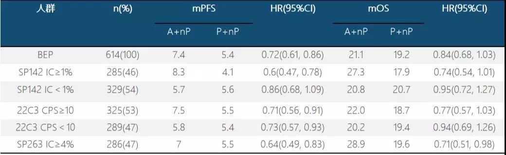 这些数据表明,SP142可能识别出与22C3或SP263不同的人群。以22C3 CPS 10诊断时,36%的患者为SP142+/22C3+,10%为SP142+/22C3-,17%为SP142-/22C3+。以SP263 IC 4%诊断时,34%的患者为SP142+/SP263+,SP142+/SP263-和SP142-/SP263+各有12%。不同切点模型下评估的中位PFS和OS见下表。