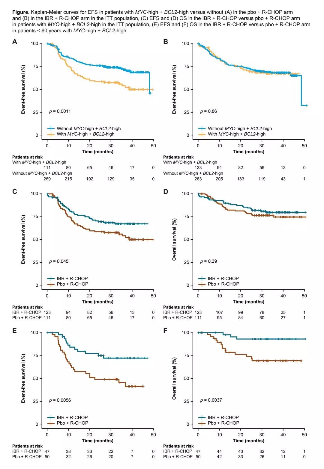 然而,在伊布替尼组,高表达和低表达人群未表现出显著的预后差异,BCL2和MYC同时高表达患者的EFS优于安慰剂组(HR 0.648;95%CI,0.423-0.993;P=0.045),OS无统计学差异(HR 0.783;95%CI,0.446-1.372;P=0.39)。在<60岁患者中(n=317),97例(30.6%)为BCL2和MYC同时高表达,伊布替尼组在EFS(HR 0.393;95%CI,0.198-0.780;P=0.0056)和OS(HR 0.191;95%CI,0.055-0.666;P=0.0037)较安慰剂组均表现出显著获益。在<60岁的低表达人群和≥60岁的高表达人群中均未发现EFS和OS的差异。