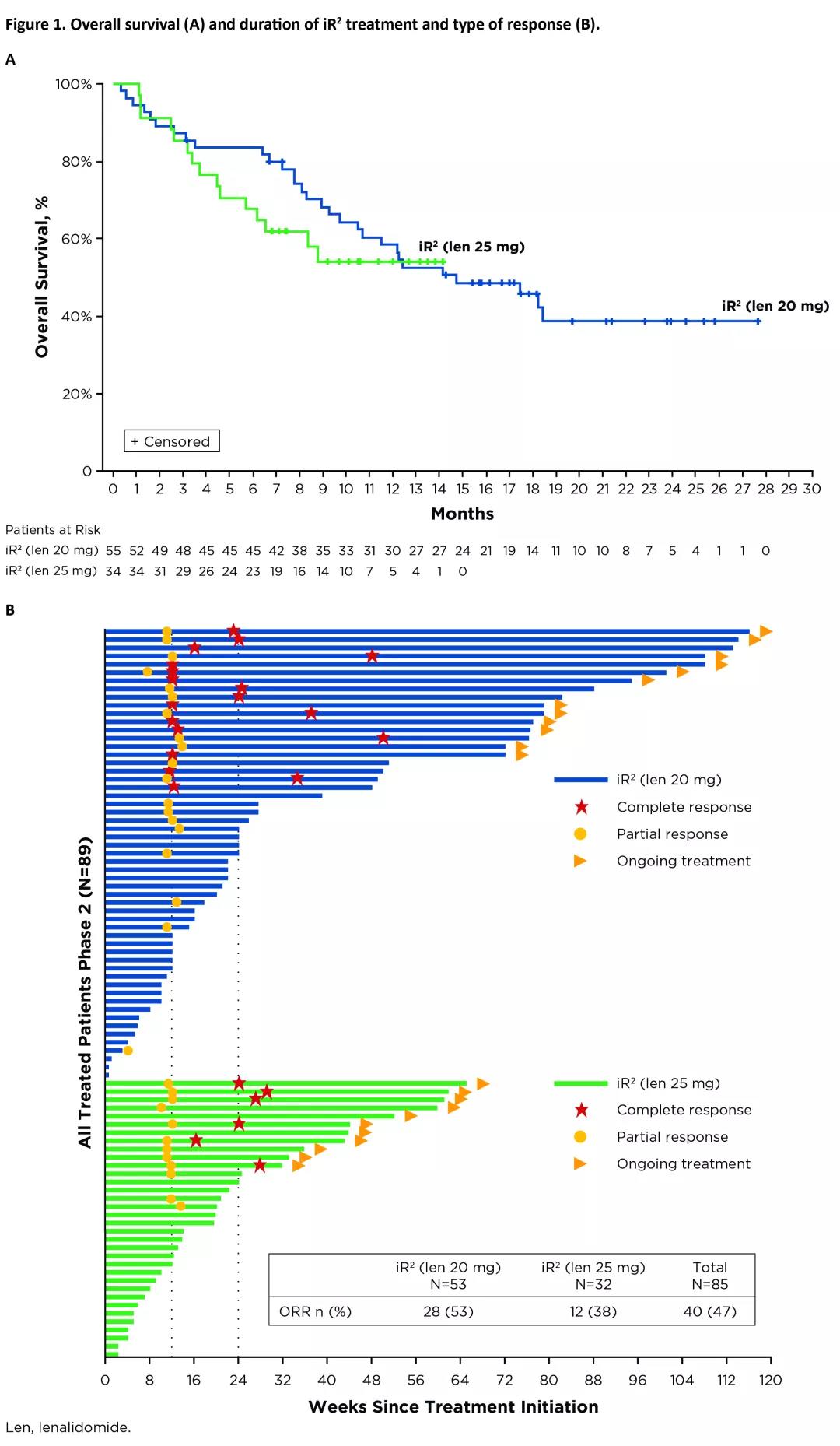 结果:总计89例患者入组,有55例接受来那度胺20mg和34例接受来那度胺25mg,中位年龄64岁,其中58%男性,53%对上一线治疗耐药(其中16%为原发耐药),47%为复发患者,63%临床分期为Ⅳ期,既往接受中位治疗线数为2线(1-5线),最常见的既往治疗方案包括R-CHOP(73%)、RICE(26%)、R-DHAP(13%),20例患者接受过移植治疗。在研究中的中位时间为16个月(1-28个月),20例(22%)和4例(4%)接受iR2方案治疗分别超过1年和2年,25例(28%)在数据分析时仍在接受治疗,中位应答时间为2.7个月。