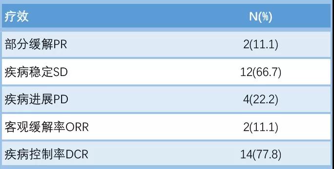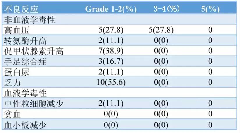 结果:自2018年7月12日至2019年7月1日,本研究共计入组18例患者,中位年龄为56岁(32-74岁),中位随访时间为2.8月(1.0-9.9月)。中位PFS为4.43个月[95%可信区间(CI),3.15-5.71月],ORR为11.1%(2/18),DCR为77.8%(14/18),mOS尚未达到,本研究最常见的与治疗有关的3~4级不良反应为高血压(5/18,27.8%),可通过药物有效控制,未观察到其他3~4级不良事件,没有患者因不良事件而减少安罗替尼的使用剂量。最常见的1-2级不良反应为乏力10/18(55.6%),TSH升高7/18(38.9%),高血压5/18(27.8%)。
