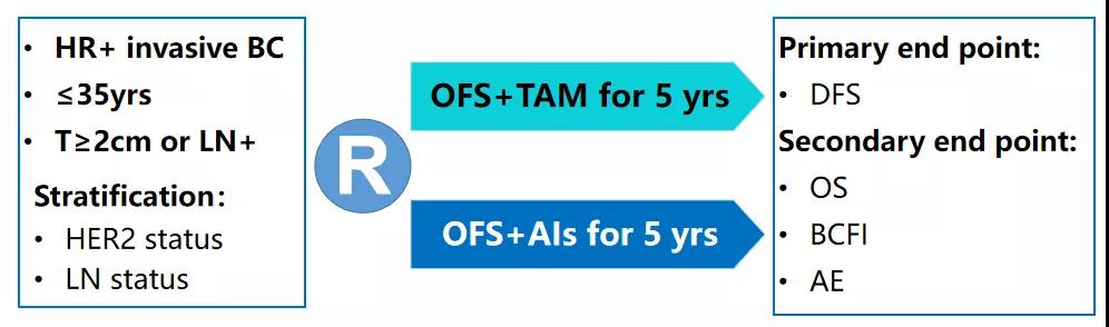 ASPAIT研究是一项由24家医院参与的多中心、随机、对照研究。入组人群为:年龄≤35岁,T≥2cm和/或腋窝淋巴结阳性的早期HR+浸润性乳腺癌患者。ASPAIT研究自2016年启动,计划入组680例患者。截至目前,该研究已入组300例患者。入组患者随机分至OFS(戈舍瑞林或亮丙瑞林)+他莫昔芬组(计划入组340例)或OFS(戈舍瑞林或亮丙瑞林)+AI(来曲唑、阿那曲唑、依西美坦)组(计划入组340例),内分泌治疗时长为5年。主要研究终点为DFS,次要研究终点为:OS、BCFI、AE等。