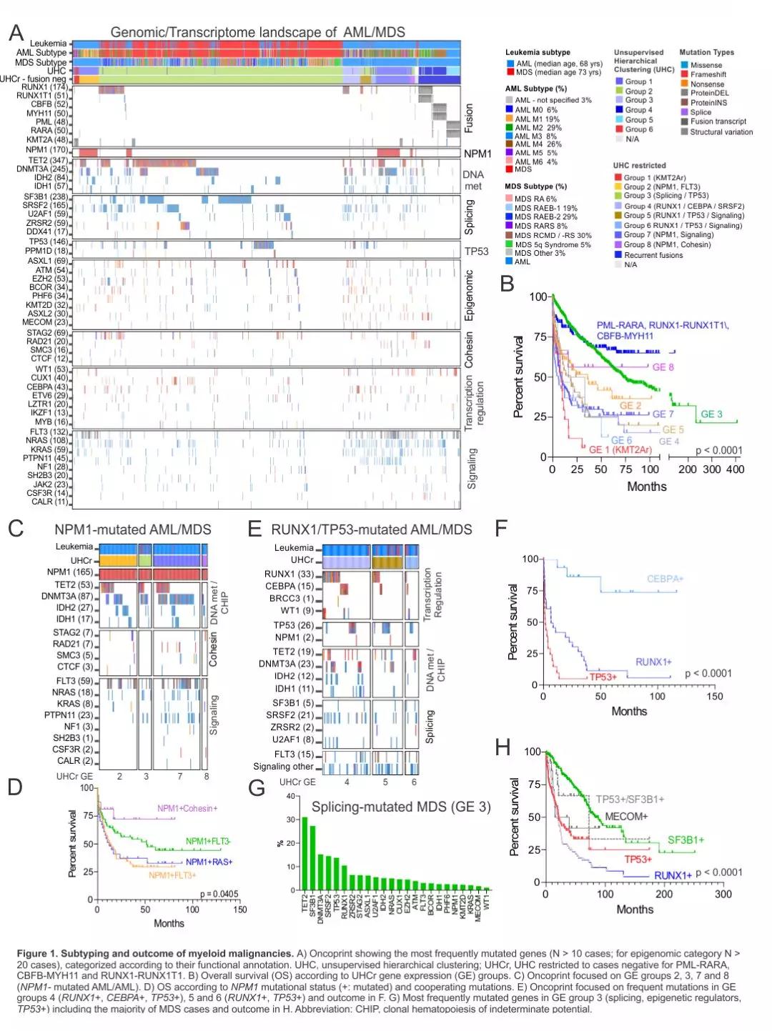 研究结论:在大队列的成人全髓白血病患者中,综合分析其突变及表达数据可定义亚型和一系列基因突变,而这具有重要的预后意义,超越了以往的基因组合的分类模式。