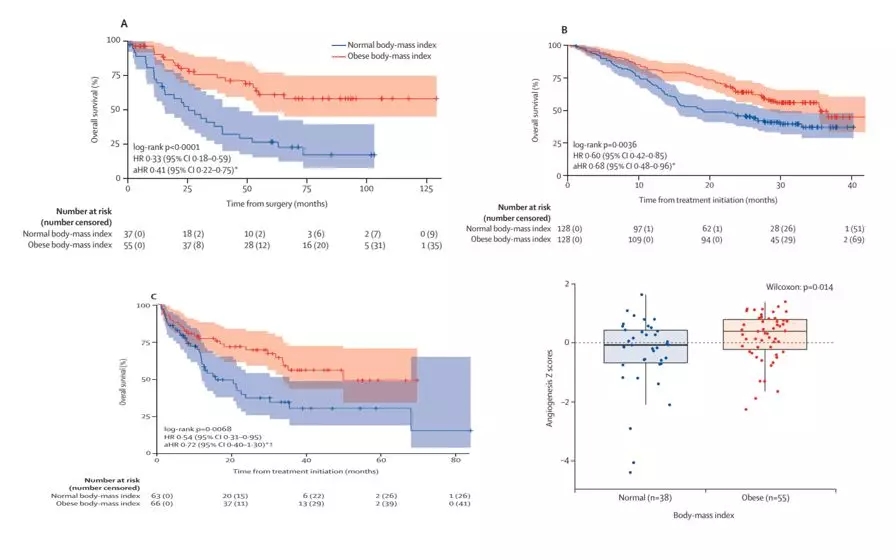 Sanchez A等评估了来自COMPARZ试验、TCGA、MSK中的5个肾透明细胞癌的独立临床队列数据。分析了肥胖(BMI>30)和正常体重(BMI 18.5~24.9)患者的总生存期,即从治疗开始时间(在对照组和MSK免疫治疗组)或手术(TCGA队列)到任何原因死亡的时间,并在另外一个前瞻性收集的非转移性肾透胞细胞癌患者队列(MSK瘤周脂肪组织队列)中,比较了瘤周脂肪组织和肿瘤组织的基因表达差异。研究者还分析了肥胖患者和正常体重患者的基因表达差异,以及MSK肾切除术后局部肾癌患者的肿瘤免疫微环境。
