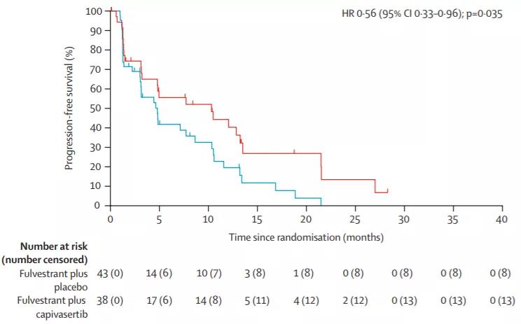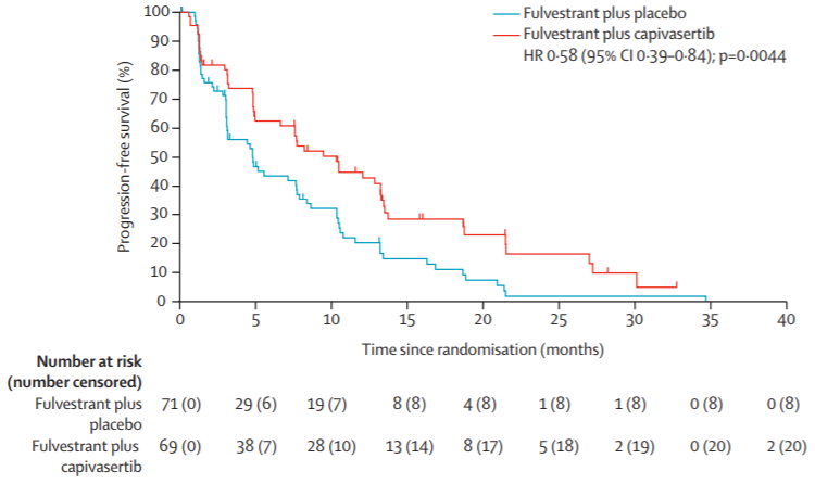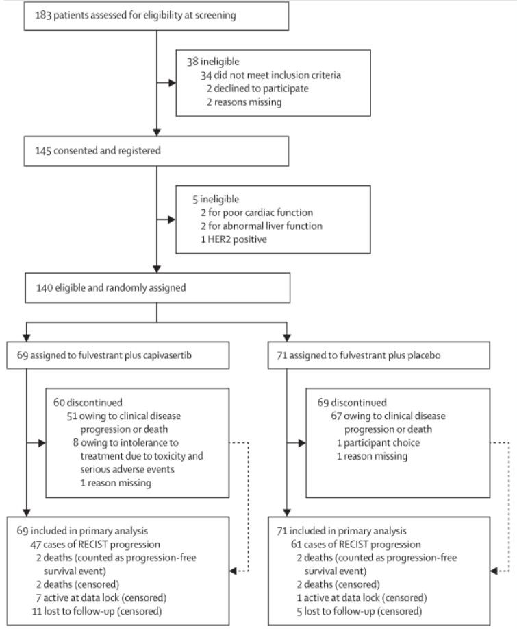 2015年3月至2018年3月,共对183例患者进行了入组筛查,其中140例(76%)患者符合入组条件并被随机分配到氟维司群+capivasertib组(n=69)或氟维司群+安慰剂组(n=71)。无进展生存的中位随访时间为4.9个月(IQR 1.6-11.6)。在对无进展生存期进行初步分析时(2019年1月30日),共发生112例无进展生存期事件,其中69例(71%)发生在capivasertib组,而安慰剂组为63例(89%)。