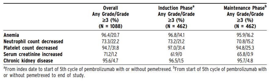 3期临床试验KEKNOTE-189证实帕博利珠单抗联合卡铂和培美曲塞可显著改善晚期NSCLC患者生存获益,但该联合疗法的真实世界数据仍较少报道。Catherine M等报道了来自美国Flatiron Health电子病历系统登记的2017年5月到2018年10月接受该联合疗法的病例数据。研究入组了1088例患者(中位年龄68岁;男性占57%)。在维持治疗(Pem/Pembro≥5)队列(n=462)中,Pembro和Pem的治疗周期中位数分别为9个和6个。诱导期中性粒细胞计数下降和血小板计数下降的发生率在数值上较高,而慢性肾脏病(CKD)则呈相反趋势(见下表)。轻度肾功能损害(5.1% vs 2.6%)和老年(≥75岁)患者(7.5% vs 3.3%)的3级CKD发生率较高。