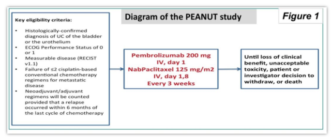 背景: 帕博利珠单抗是接受过全身化疗的转移性UC患者新的标准治疗推荐。白蛋白紫杉醇在晚期UC中显示出初步的活性。PEANUT研究探索了白蛋白紫杉醇联合帕博利珠单抗在化疗失败后晚期UC患者中的应用