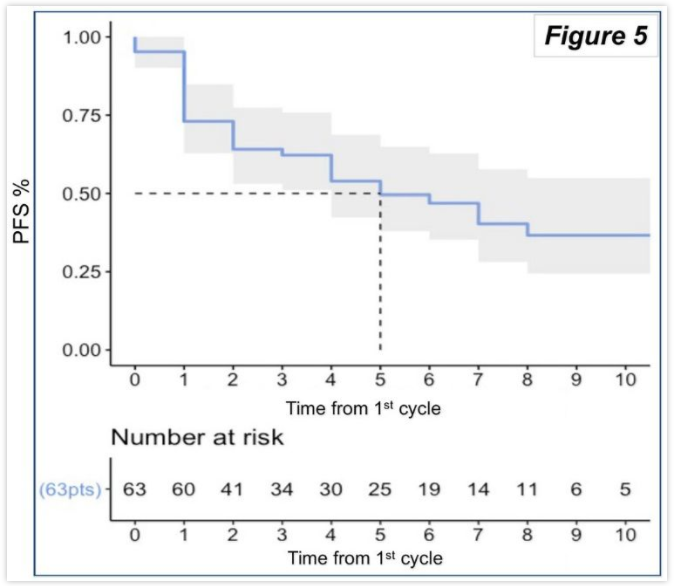 中位随访5个月,33例患者复发(52%)。中位PFS为5个月(95%CI: 4-未达到)。经疗效确认的客观应答率(ORR)为44.4%: 19例患者PR(30.2%),9例CR(14.4%);总体临床获益率为73%;中位DoR未达到(n=28)。