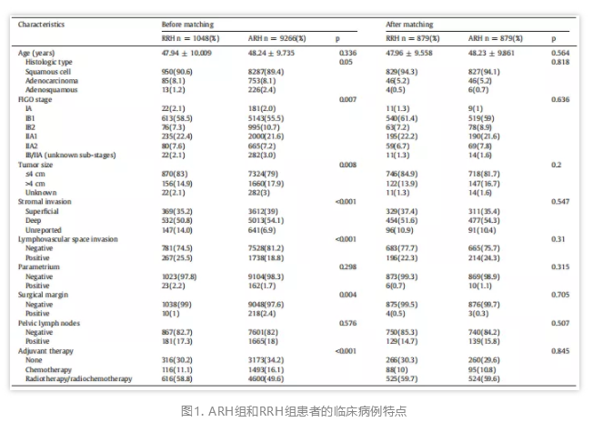 统计数据发现:①ARH组中IB1和IB2期患者比例明显高于RRH组;②RRH组中IIA1和IIA2期患者比例明显高于ARH组;③RRH组中出现LVS.I的比例明显高于ARH组;④ARH组中,患者肿瘤病灶更大,深基质侵犯可能性更大;⑤ARH组中术后切缘情况可能优于RRH组;⑥RRH组中术后行辅助治疗患者的比例更高。(图1)
