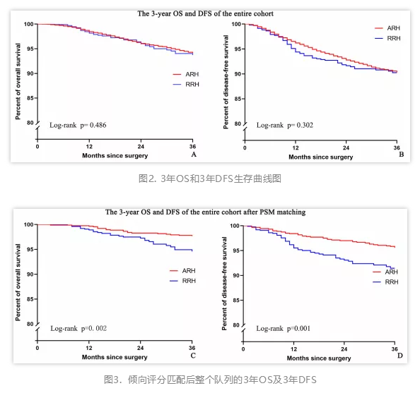 总体而言,ARH组和RRH组患者的3年OS分别为94.1%和93.5%(p=0.486)(图2),通过多变量分析,相比于ARH组患者,RRH与3年OS低无关(HR=1.23,95%CI: 0.89-1.7,P=0.206)。ARH组和RRH组患者的3年DFS分别为90.4%和90%(P=0.302)(图2),然而RRH与3年DFS低有关(HR=1.20,95%CI: 1.09-1.52,P=0.035)。在对数据进行倾向得分匹配后,无论是3年OS还是3年DFS,ARH组均要优于RRH组(图3)。