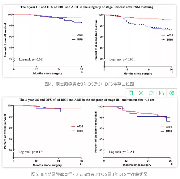 在6930例I期患者中,RRH患者的3年OS和3年DFS均差于ARH组(95.7%vs. 98.5%, P=0.011;92.6%vs. 97.7%,P<0.001)(图4),并且RRH均是3年OS和3年DFS的独立预后因素。在982例IB1期及肿瘤直径<2cm患者中,RRH组和ARH组有相类似的3年OS和3年DFS(96.4%vs 98.5%,P=0.174;92.6% vs. 95.2%,P<0.354)(图:5),并且RRH均不是3年OS和3年DFS的独立预后因素。另外结合RRH在术中出血、输血率、淋巴清除数及术后恢复等方面的优势,RRH对IB1期及肿瘤直径<2 cm的宫颈癌患者可能是个更好的选择。