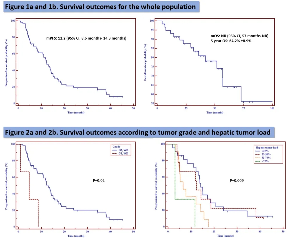 图6. 整体人群的生存结果以及不同肿瘤分级、肝转移负荷亚组的生存结果