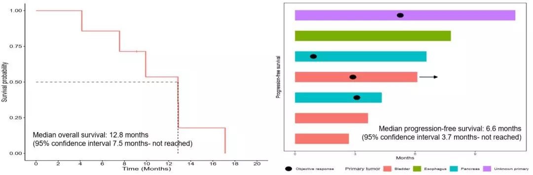 本届ENETS年会还报道了一项来自ENETS卓越中心的免疫二线治疗NEC G3患者的前瞻性研究,转移性肺外神经内分泌癌(EP-NEC)在一线接受了铂-依托泊苷方案的治疗后,有7例患者二线接受免疫治疗,肿瘤原发部位为膀胱(3例)、胰腺(2例)、食管(1例)和未知(1例)。其中,4名患者出现部分缓解,中位OS为12.8个月(95% CI:7.5-NR),中位PFS为6.6个月(95% CI:3.7-NR)(图3),2名患者还在治疗中,免疫治疗的耐受性良好[4]。这项研究发现部分患者对免疫治疗有效,与前一项研究结果显示的零有效率有矛盾之处,两项研究纳入的基本都是肺外神经内分泌癌病例,为何结果有很大差异?我认为未来需要进一步探究对免疫治疗有效的NEC患者的肿瘤原发部位和肿瘤生物学行为等特征,以筛选出对免疫治疗高敏感的患者。