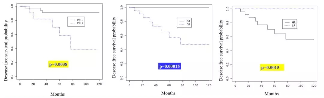 他的另一项研究验证了分化良好的无功能性胰腺神经内分泌肿瘤(NF-pNETs)根治性手术后疾病复发风险的一个评分系统,该评分系统确定了肿瘤分级、阳性淋巴结和周围神经浸润(PNI)是独立的风险因素,本研究发现肿瘤分级良好的、无淋巴结转移和无周围神经浸润的患者的生存情况更好(图2)。作者认为这种复发风险分层可能对选择高危患者进行辅助治疗有帮助[2]。