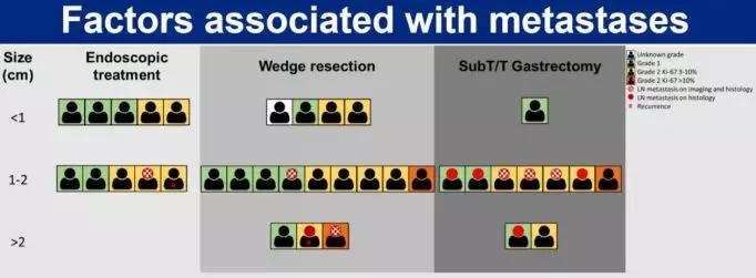第二项是一项多中心的回顾性研究,主要探讨III型胃神经内分泌肿瘤的手术范围,该研究共收集了45例G1-G2级患者,主要手术方式包括内镜切除(EMR/ESD)、楔形手术切除(WR)和全胃或胃大部切除( Sub/total gastrectomy),部分患者未经手术治疗,主要是随访和药物治疗。这项研究得出的主要结论是,对于直径<2cm且ki-67指数<10%的III型患者,胃镜下切除或楔状切除似乎是足够的治疗方式(图4),但仍需要更多的研究去确认适合内镜切除的患者,以及淋巴结或远端转移的相关风险因素[4]。