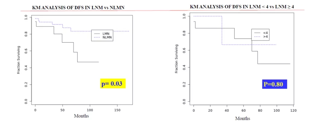 图1. 有/无淋巴结转移患者组的DFS;淋巴结转移数目<4和≥4患者组的DFS