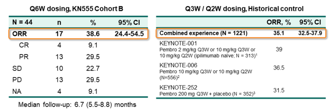 研究目的:帕博利珠单抗已被先后批准2mg/Kg和200mg,每3周一次给药。为进一步提高患者生活质量,减少频繁去医疗机构输液等不便,KN555研究对400mg/每6周一次给药是否与3周一次给药的浓度和疗效一致做了比较分析。该研究共入组了100例晚期阶段未接受系统治疗的局部晚期不可手术或者晚期黑色素瘤患者,这次会议公布了其中44例患者的初步结果。