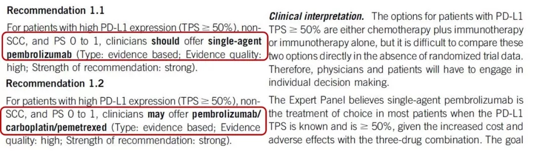 CSCO指南:对于PD-L1≥50%的患者,CSCO指南仅仅推荐Pembrolizumab单药,并未涉及联合化疗的相关问题,而另外两项指南——NCCN和ASCO指南均做了推荐。