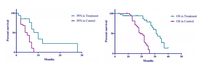 该II期临床研究共纳入97例IIIB-IV期非小细胞肺癌(NSCLC)患者,既往接受多种治疗方法,对化疗、靶向治疗、免疫治疗无反应或耐药。上述患者接受静脉输注大剂量VitC(1g/kg),与射频局部深部热疗(modulated electrohyperthermia,mEHT)同步治疗25次后,相比单纯最佳支持治疗组,显著改善其生活质量,能显著延长该类患者的无疾病进展生存期(PFS)与总生存期(OS)(PFS: 3个月 vs. 1.85个月; OS: 9.4个月vs. 5.6个月)(图1),3个月疾病控制率达42.9%(单纯最佳支持治疗组为16.7%)。