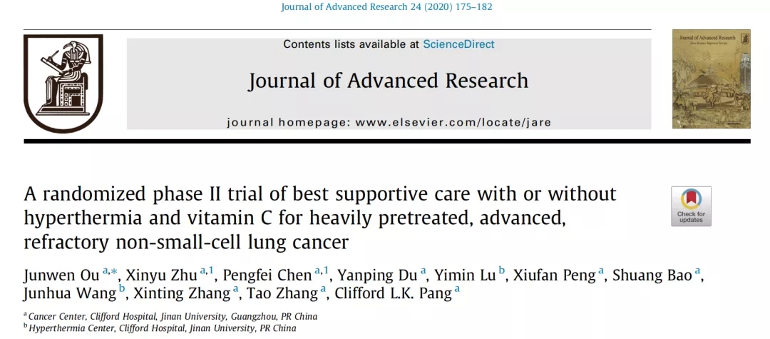 近日,知名综合类期刊杂志Journal of Advanced Research(影响因子:5.05)发表了暨南大学附属祈福医院区俊文团队题目为“A Randomized phase II trial of best supportive care with or without hyperthermia and vitamin C for heavily pretreated, advanced, refractory non-small cell lung cancer”的临床研究论文[1]。这是该团队关于大剂量维生素C(VitC)临床研究的第三篇SCI文章(另2篇分别发表在European Journal of Pharmaceutical Sciences 和Integrative Cancer Therapies杂志)[2-3]