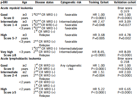 本研究分别纳入<18岁、接受过Allo-HSCT治疗的AML患者1135例和ALL患者1228例,平均随机分至测试队列(training)及验证队列(validation)中,采用逐步回归法对两组队列进行单独分析,主要的生存结局指标为无白血病生存期(LFS)。结果显示:①对于儿童AML患者而言,p-DRI划分了good(0分)、intermediate(1~4分)、high(5~7分)及very high(≥8分)4个分层,其5年无白血病生存率(LFS)则依次为81%, 56% ,44%和21%。②对于儿童ALL患者而言,p-DRI划分了good(0分)、intermediate(2~4分)及high(≥5分)3个分层,其5年LFS则依次为68%, 50%和15%。