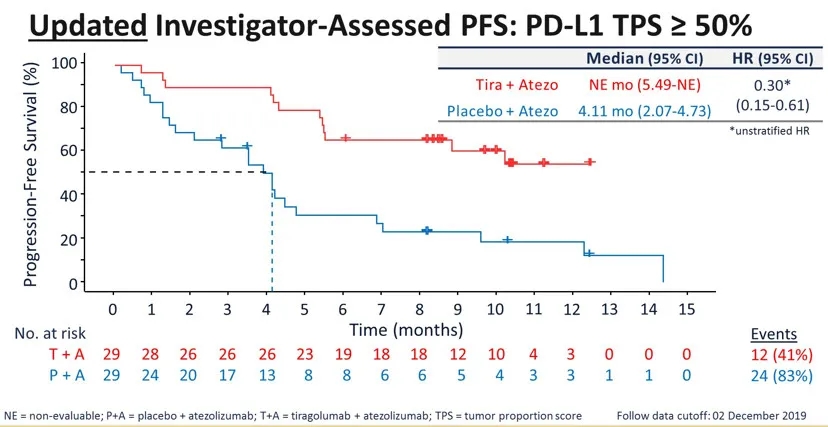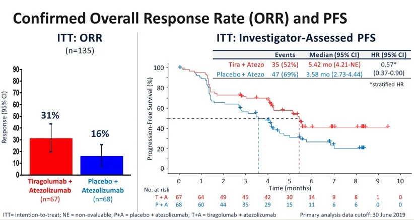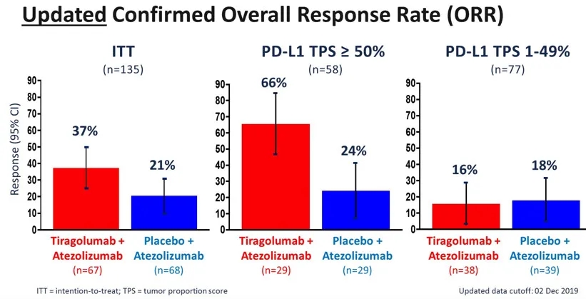 该研究得出结论:与阿替利珠单抗相比,Tiragolumab+阿替利珠单抗能显著提高ITT人群的ORR和PFS,PD-L1 TPS≥50%的亚组的改善幅度更大。两种治疗安全性相似。