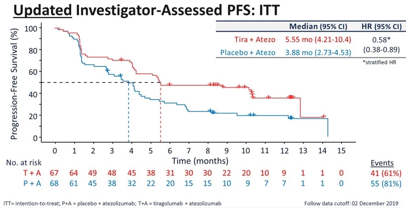 最新随访结果:初步分析后,该研究又进行了6个月的随访(截至2019年12月2日,中位随访10.9个月),在后续6个月随访中,TA组相比PA组患者的ORR(37.3% vs 20.6%)和中位PFS(5.6个月 vs 3.9个月)的优势仍持续存在,与初步分析一致。