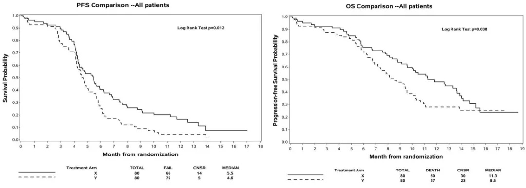 摘要号为9000的ECOG-ACRIN EA5161研究探索了纳武利尤单抗联合一线标准化疗的疗效及安全性,最终共有160例患者入组研究。中位PFS分别为5.5个月和4.6个月,中位OS分别为11.3个月和8.5个月,差异均有统计学意义的。这提示,在标准化疗方案的基础上联合纳武利尤单抗,可以给患者带来PFS和OS的双重获益。