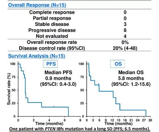 摘要号为9064的LC-SCRUM-Japan研究探索了携带PI3K/AKT/mTOR通路异常的患者,接受相应靶向治疗的疗效。这项多队列研究中,ED-SCLC队列共纳入15例患者,其中6例患者既往接受过2种或以上治疗,为复发难治型。患者整体ORR、DCR、PFS和OS分别为0%、20%、0.9个月和5.8个月,在数值上与安慰剂相似。这提示,PI3K/AKT/mTOR通路异常的患者,接受相应靶向治疗没有获益。